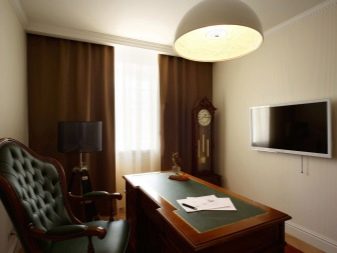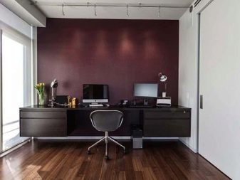 В същото време рафтовете и рафтовете в офиса могат да бъдат направени в тъмен цвят. Бургундските завеси могат да бъдат последният щрих към такъв луксозен офис..