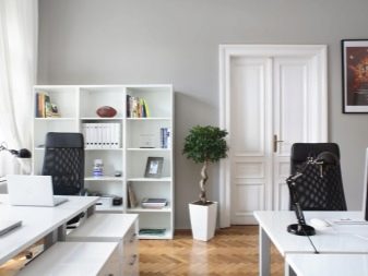 Неразделна част от всеки офис са и многофункционалните шкафове, в които могат да бъдат разположени всички необходими неща, стелажи и рафтове за различни инвентар и документи. Гардеробите често са затворени мебели. Те могат да премахнат всичко, което трябва да бъде скрито от любопитни очи, но рафтовете най -често се отварят, можете да поставите различни книги и декоративни елементи върху тях..
