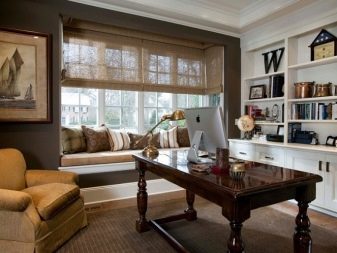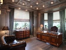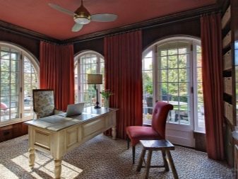 В същото време рафтовете и рафтовете в офиса могат да бъдат направени в тъмен цвят. Бургундските завеси могат да бъдат последният щрих към такъв луксозен офис..