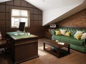 Не по -малко интересен модерен стил е таванското помещение. Той има своя специална атмосфера. Това не означава, че това определено е мъжки стил, но силният пол го харесва най -много. В стила на таванско помещение могат да се използват вече „изоставени“ мебели, но в същото време компетентно актуализирани и, разбира се, модерни. Цветовата гама може да варира от сиво до кафяво. По принцип в офиса на таванското помещение тук се показват някои обекти, които например са скрити в минимализъм.