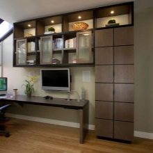 Неразделна част от всеки офис са и многофункционалните шкафове, в които могат да бъдат разположени всички необходими неща, стелажи и рафтове за различни инвентар и документи. Гардеробите често са затворени мебели. Те могат да премахнат всичко, което трябва да бъде скрито от любопитни очи, но рафтовете най -често се отварят, можете да поставите различни книги и декоративни елементи върху тях..