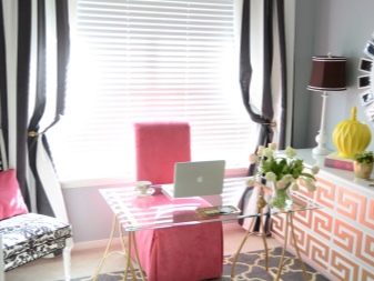 Хармоничното изследване на младо момиче или студентка, което обича голи нюанси на розово, може да изглежда много приятно и красиво. Стъклена маса, допълнена от удобно розово кресло, определено ще привлече вниманието не само на младата домакиня, но и на гостите на стаята..