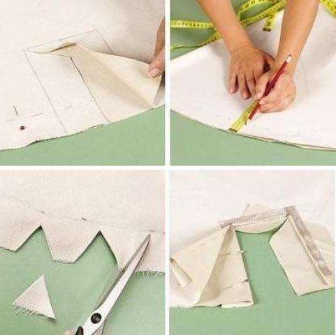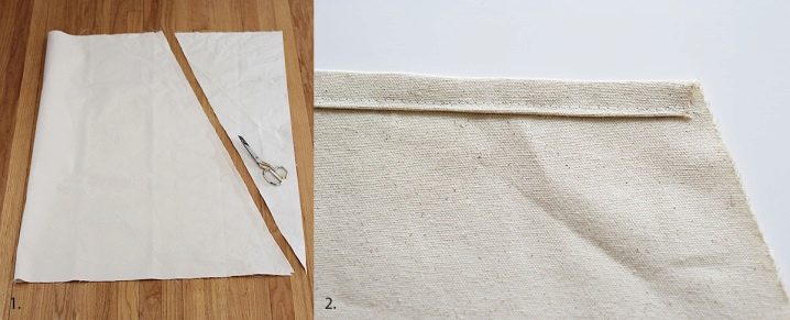 - Първо трябва да вземете плата, да го сгънете наполовина, да измерите 18 см от горния ъгъл и нарисувайте диагонал до долния десен ъгъл. Ще получите неравен триъгълник, който трябва да бъде изрязан и отстранен. Основната част от тъканта трябва да се разгъне, а страните на кройката да бъдат зашити, като едновременно с това вдигат краищата им на сантиметър.