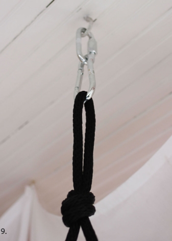 - Два свързани карабинера трябва да бъдат прикрепени към куката на тавана, прокарайте кабела в долния карабинер. По този начин конструкцията ще придобие достатъчна здравина за безопасно люлеене в стола..