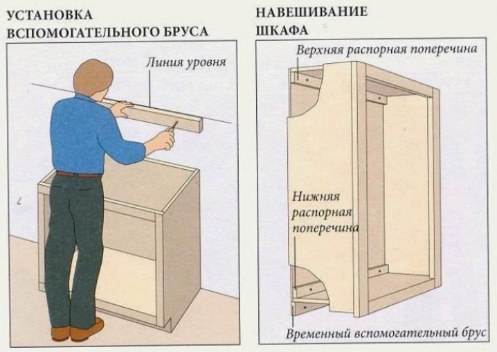 Когато инсталирате, първо трябва да прецените състоянието на стената, върху която ще бъдат монтирани висящите шкафове. Ако в близко бъдеще се планират ремонти, а стената, където ще виси конструкцията, е направена от гипсокартон или пластмасови панели, тогава е по -добре да фиксирате дървен блок на нивото на закрепване на шкафовете, така че шкафовете да се държат добре. Ако ремонтът вече е извършен, но фактът за наличието на шина в стената е неизвестен, тогава при монтажа на монтажната шина винтовете трябва да се поставят по -често.