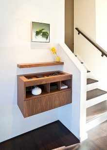 Висящите шкафове в коридора са чудесни за съхранение на битови предмети. С тяхна помощ можете да скриете куп несезонни предмети. Конструкциите не заемат използваемата площ на помещението, като същевременно остават много функционални. В стенни шкафове с врати можете да скриете малки неща, които изглеждат неестетично на нощни шкафчета.