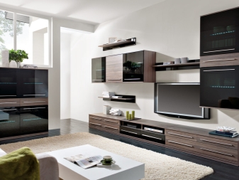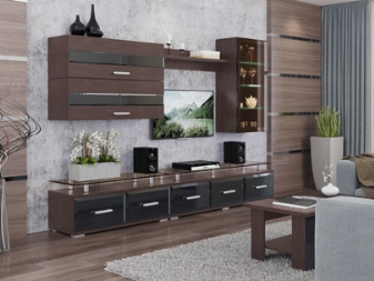 Ако пространството на стаята позволява, тогава можете да инсталирате радиусни композиции. За малки помещения е по -добре да използвате малки мебели със система за отваряне на люлеещи се врати. Хоризонталните опции са подходящи за малка всекидневна..