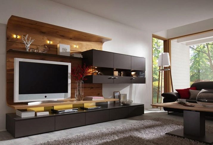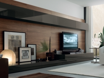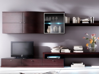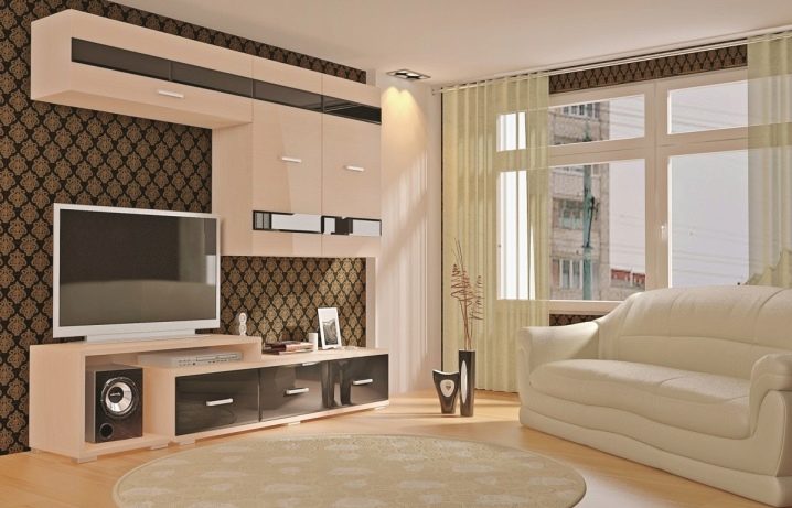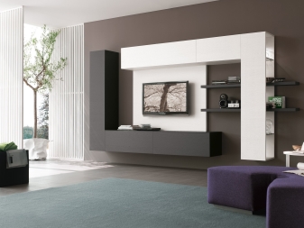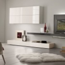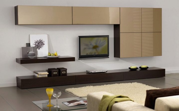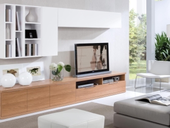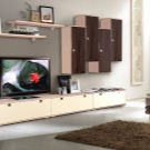 Ако пространството на стаята позволява, тогава можете да инсталирате радиусни композиции. За малки помещения е по -добре да използвате малки мебели със система за отваряне на люлеещи се врати. Хоризонталните опции са подходящи за малка всекидневна..