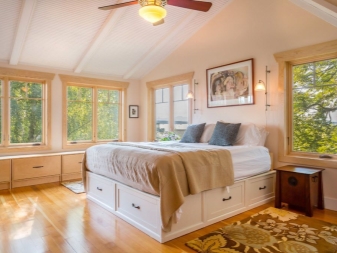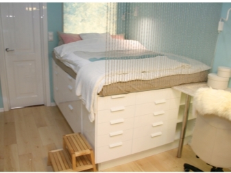 - Това е чудесно решение за малка спалня.. Да, да, голямото и обемно легло под леглото има чекмеджета и шкафове, в които можете да поставите много неща. Всъщност не е нужно да купувате и инсталирате скрин или гардероб в спалнята. Спалното бельо и личните вещи могат да бъдат поставени там. Често обувки или дрехи се съхраняват там извън сезона..