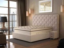 - Високият запас в американски стил изглежда солиден и солиден. Това е доста масивна мебел (и между другото, много често е изработена от масивно дърво). “Американско” легло винаги има гръб – дърво или тапициран с плат. Съединителят на каретата изглежда много добре на таблата. Таблата може да бъде много висока – почти цялата стена. Именно тези модели се поръчват най -добре с чекмеджета в долната част – стилът позволява това.