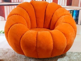 Изборът на формата на такова кресло е не по -малко изненадващ. От най -популярните трябва да се отбележат следните опции: круша, футболна топка (идеална за деца), баскетбол, топка, сърце, пирамида, тиква, портокал, цвете, шайба, кола и др..