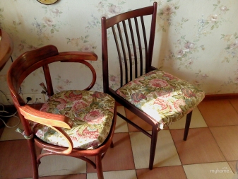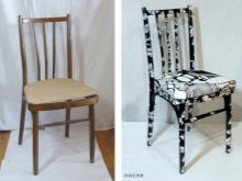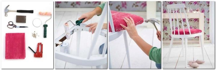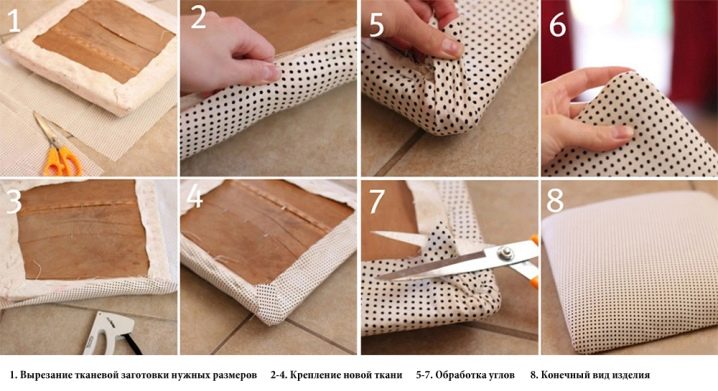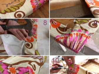 Последният етап от ремонта се състои в създаване на красива тапицерия. След като сте отстранили старата тапицерия, основата на седалката се изрязва от възглавницата от пяна, която след това се прикрепя към повърхността с помощта на лепило. За допълнително фиксиране можете да използвате кламери. След като сте издърпали добре плата по цялата седалка, фиксирайте го с щипки за мебели отдолу. В зависимост от личните предпочитания, тъканта може да има ярък модел или изобщо да няма модел.