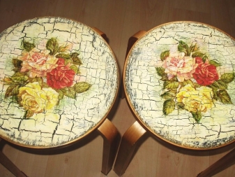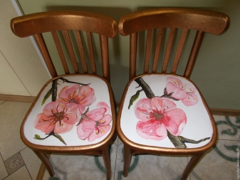 Първо се обработва една част от стола и отгоре се прикрепя парче от шаблона. За да предотвратите образуването на мехурчета върху него, вземете парче плат и внимателно изгладете шаблона, започвайки от средата. Останалата част от конструкцията е декорирана по същия начин. И за надеждно фиксиране след изсушаване, той трябва да бъде покрит с акрилен лак..