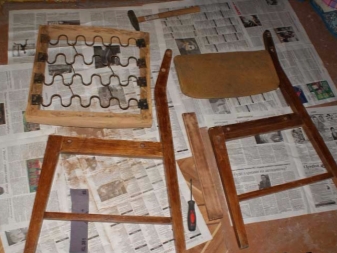 Ако седалката на стола е монтирана на пружинен блок, тя трябва да бъде заменена с нови пружини. За това не е необходимо да премахвате целия блок..