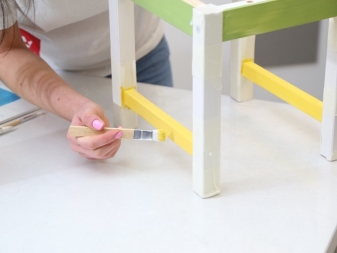 Първо върху почистената повърхност на стола се нанася грунд, който напълно съответства на цвета на продукта. След изчакване за пълно изсъхване, грундът се почиства с шкурка, за да се получи тънък слой покритие. След това продуктът е покрит с боя или лак, изчакайте да изсъхне и нанесете друг слой.