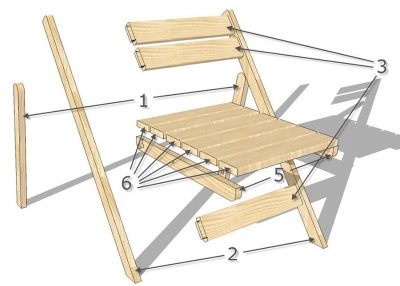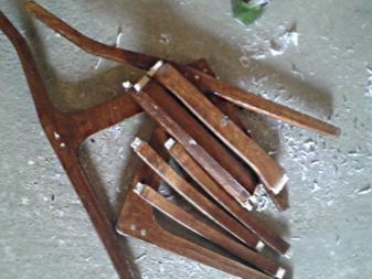 За да разглобите сгъваемия стол, достатъчно е да премахнете аксиалните щифтове, които свързват облегалката и седалката, и след това да премахнете седалката. Конструкциите на метална основа се разглобяват по -лесно – трябва да развиете седалката и меката част на облегалката.