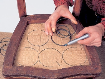 За да се преработи седалка с пружини, първо се фиксира вата, а след това слой пенопластов лист. Материята е прикрепена на същия принцип, както при един слой пяна, но се дърпа с голям акцент, за да се изглади релефът на пружината.