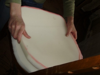 Моделът е направен върху дебел картон, очертаващ старата тапицерия. Полученият шаблон се прехвърля в нова тъкан, след което частта се изрязва. Същото се прави и с гума от пяна. След като сте подготвили всички подробности, можете да продължите към стесняването. Първо трябва да залепите пяната от гума към седалката, след това да прикрепите тъканта към нея, като огънете ръбовете навътре. Можете да го фиксирате с лепило и малки пирони. В този случай тъканта трябва да бъде плътно издърпана върху седалката.