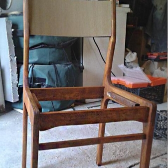 След като актуализирате рамката на стола и плъзнете меките части с тапицерията, остава само да сглобите продукта. Сглобяването се извършва по същия сценарий като разбора. Краката и облегалката са поставени в същите прорези, където са били преди ремонта. Шперплатът е прикрепен към рамката или с лепило, или с кламери..