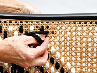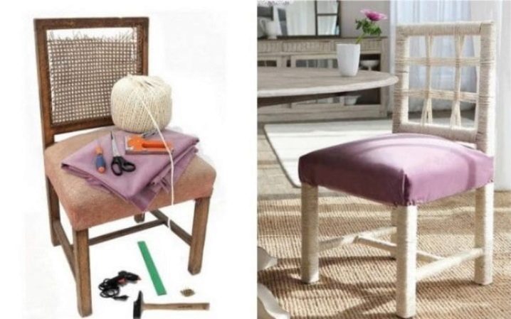 Трябва да започнете ремонт, като премахнете старата тапицерия от седалката и облегалката. След това детайлите на гърба се обвиват със сизал, плавно преминавайки към краката. Това трябва да се направи така, че въжето да приляга плътно около детайла и всеки следващ ред да е близо до предишния. Трябва да фиксирате материала с лепило.