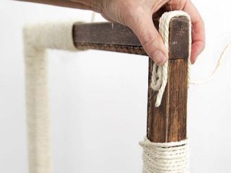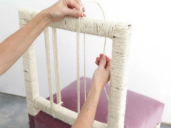 След като приключите с опаковането на всички елементи, трябва да създадете декорация на гърба. За да направите това, въже на няколко слоя в 2-3 реда се навива първо между горните и долните стъпала, а след това между страничните.