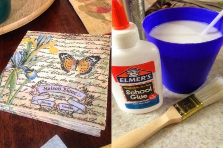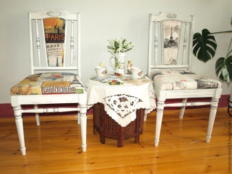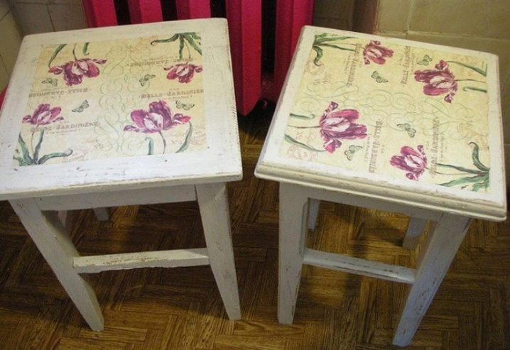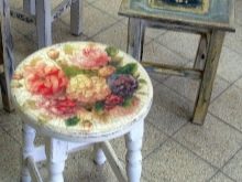 Тази опция работи добре за антични изделия от дърво с твърда седалка. За работа ще ви трябват модели от списания, лепило, четка, акрилен лак, ножици, плат, конци и игла.