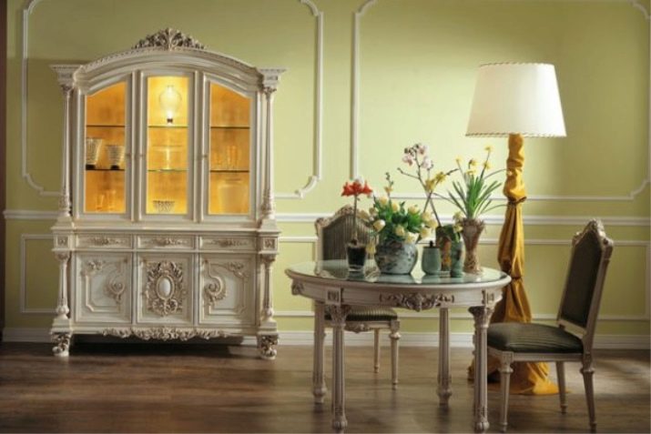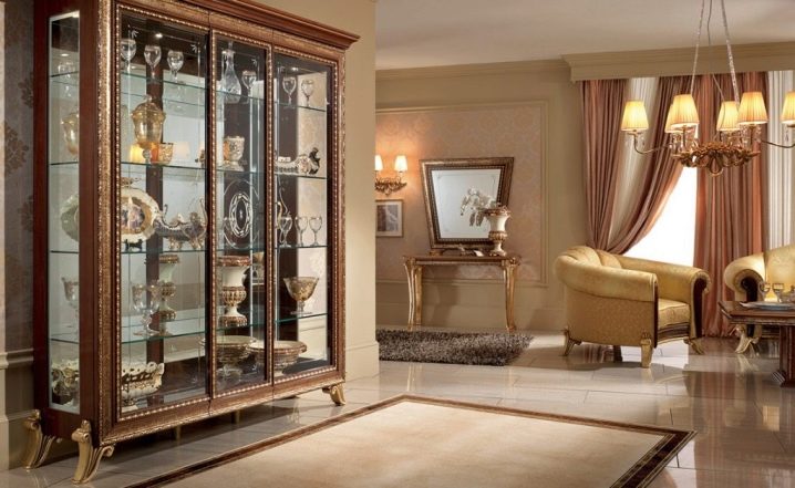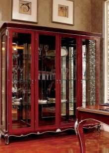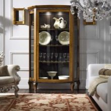 - Естетика. Интериорът на вашия апартамент веднага ще се трансформира веднага щом инсталирате такива мебели. Съдържанието на стъклените рафтове ще привлече вниманието на гостите и ще предизвика техния интерес. Най -често производителите произвеждат такива дизайни от естествено дърво, декорирайки ги с позлатени дръжки, изкуствени камъни, изящни и красиви шарки. С такава мебел луксозната всекидневна ще изглежда още по -изтънчена. В допълнение, много фирми се занимават с производство на по -евтини опции за шкафове, като използват например пластмаса, MDF и т.н. Всеки купувач лесно може да намери подходящ модел.