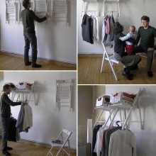- Закачалки за столове – в сгънато състояние са предназначени за съхранение на дрехи, а в разгънато състояние са удобна седалка с висок гръб.