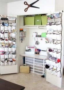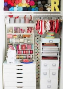 Ако вашата дейност не предполага такива глобални инсталации като шевна машина или овърлок, но все пак е необходима малка маса, тя може да бъде инсталирана вътре в шкафа – от една стена до друга или по -къса, ако имате нужда от много малка маса. Тогава рафтовете за материали могат да бъдат разположени отстрани на масата..