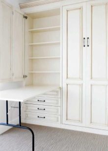 Колкото по -функционален е шкафът, толкова по -добре. Така нареченият конвертируем шкаф може да бъде изработен със сгъваема маса. Тази опция е особено подходяща за малки стаи, тъй като те обикновено имат много малко място..