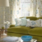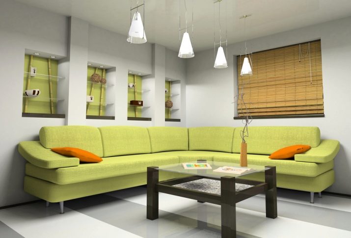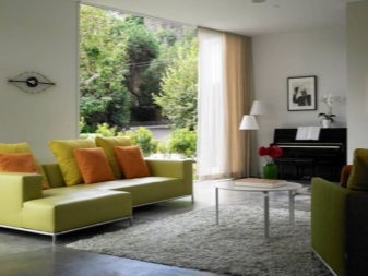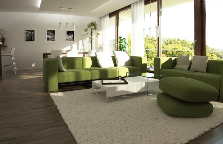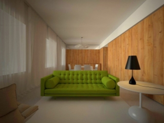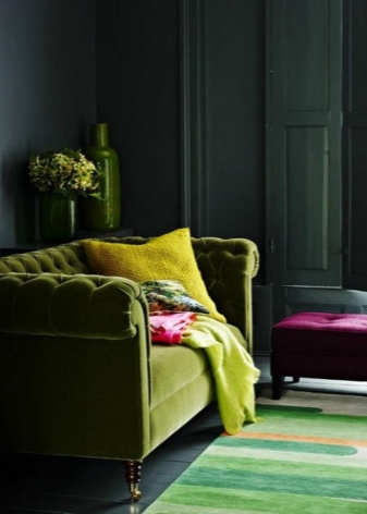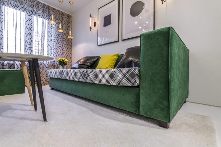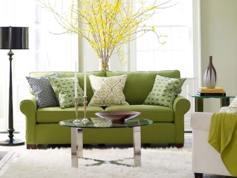 Зеленият диван може да служи като общ фон на интериора и да бъде ярък акцент на цялото дизайнерско решение в стаята..
