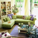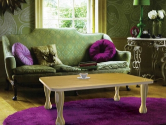 Виолетово-зеленият интериор ще изглежда страхотно в бохемски стил. В този случай цветът на дивана трябва да бъде дълбок нюанс на зелено и е по -добре да използвате лилаво само като акценти – например възглавници или малки килими..