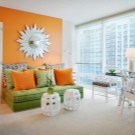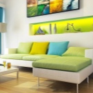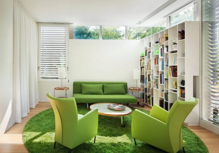 Така например, в бял хол, зелен диван с цвят на млада трева ще изглежда страхотно. Той не само ще привлече вниманието, но и ще създаде впечатление за остров на природата в града, и ще ви помогне да се отпуснете след тежък работен ден. Бяло -зеленият интериор е подходящ както за селска къща, така и за апартамент (дори малки размери).