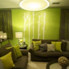 Зелено-кафявият интериор може да се дължи и на класическата комбинация от цветове. Мебелите от естествено дърво перфектно ще освежат с жълто-зелен диван.
