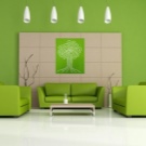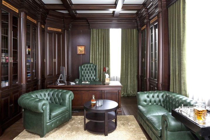 За офиса зелен диван, изработен от кожа или кадифе, е идеален. Много често тук се поставят мебели, изработени по индивидуален дизайнерски проект. Предпочитат се дълбоки тъмни или изумрудени тонове.