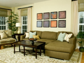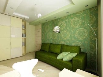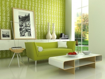 Зелен диван в бежова стая ще изглежда много добре. Тук трябва да дадете предпочитание на маслинен или светлозелен тон. Освен това бежовите стени могат да бъдат допълнени със съответни кресла. Бежовият и зелен дизайн ще приличат на разходка в гората.