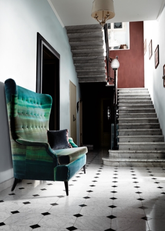 - Голям блатен диван върви добре с естествено дърво и бордо нюанси върху текстил.