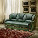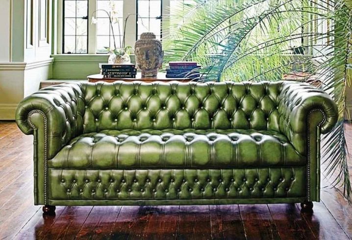 Кожените зелени дивани също са популярни. Такъв диван не изисква специални грижи, може просто да се избърше с влажна кърпа. Освен това, не се страхувайте, че разлят сок (или дори вино) ще го съсипе, всички следи се отстраняват без никакви проблеми. Въпреки това, ако едно дете рисува по повърхността с химикалка, ще бъде много трудно да почистите кожените мебели. Тези зелени дивани са инсталирани в класически интериор, въпреки че тавански, модерен и други модерни стилове също могат да се комбинират с такъв материал. Разбира се, ако финансите позволяват, по -добре е да изберете естествена кожа. Ако бюджетът ви е ограничен, съвременната индустрия предлага отлична възможност за по-бяло, но по-скоро висококачествено покритие-това е еко кожа..