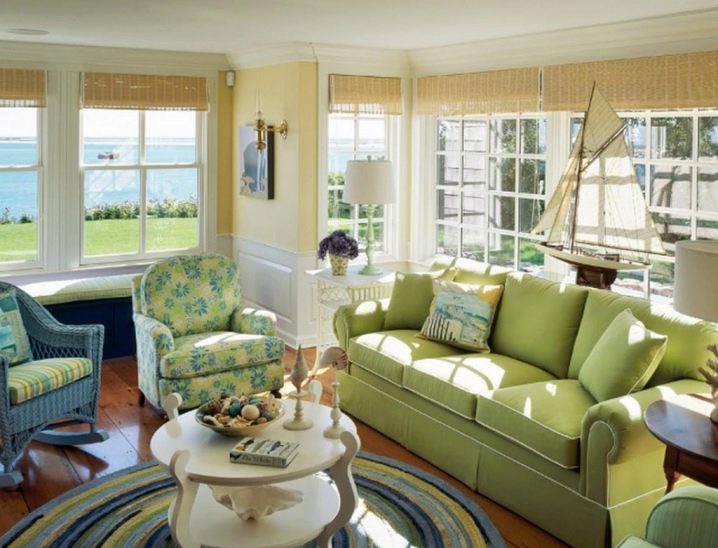 - Дневна в селски стил. Маслиновият диван перфектно допълва стила на стаята като цяло..