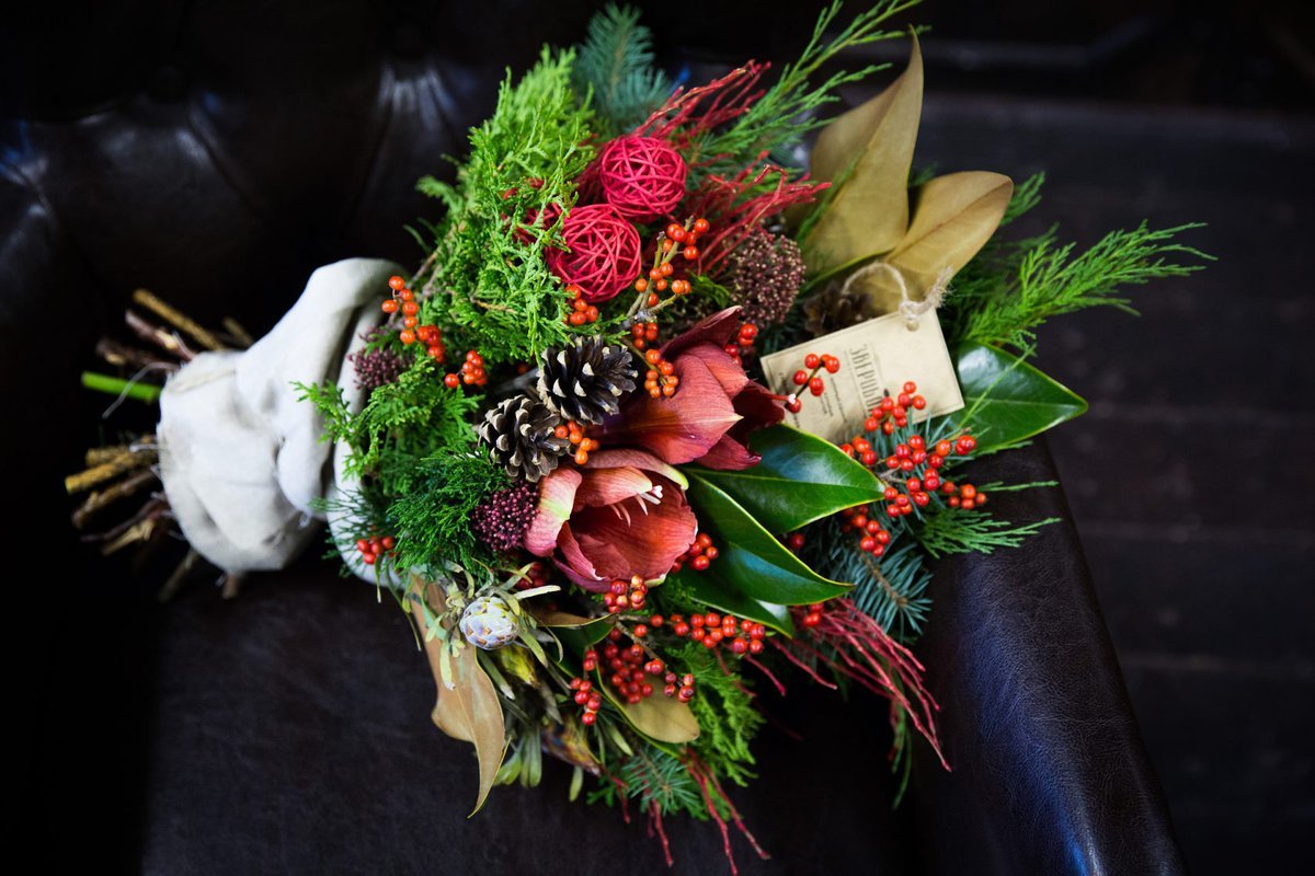 Buketten har form som en omvendt halvmåne, skabt af de hængende grene af to sorter eukalyptus – cineria og populus. Også brugt til det: anthurium, terry tulipaner Bryllupsgave og anemoner.