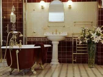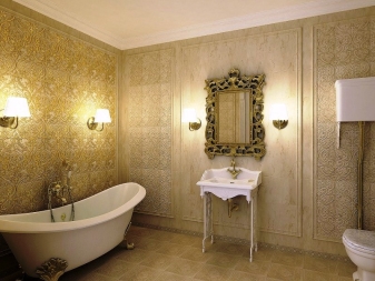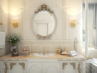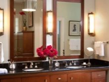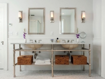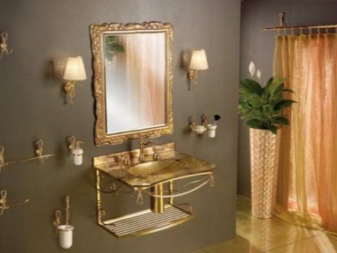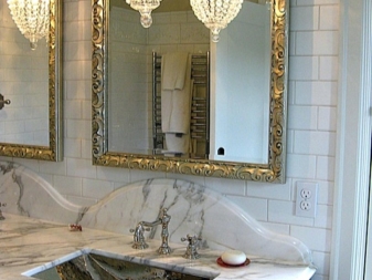 Ако изображението на стенни лампи повтаря елементите и съответства на стила на огледалото, тогава в този случай винаги получавате завършен, хармоничен интериор на банята..