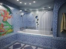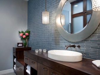 - Днес има голям асортимент от различни модели, които не само осветяват банята, но и я украсяват, придавайки определена пикантност. Можете лесно да изберете формата, материала и цвета в зависимост от стила на стаята.