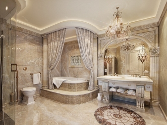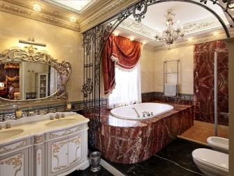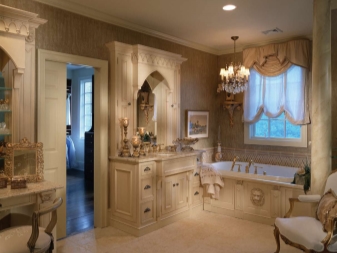 Кристалните лампи с голям брой висулки, изработени от кръгли мъниста, както и стоманени или ковани свещници, ще бъдат чудесно допълнение към баня в бароков, арт нуво или готически стил..