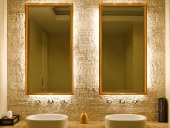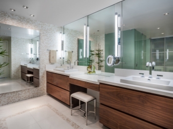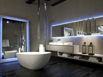 Един от най -популярните варианти днес се счита за осветяване на работната зона с помощта на LED лампи. Такива осветителни тела могат да бъдат вградени в огледала или монтирани над тях. Лаконичен стил, строга геометрия и хармонични нюанси позволяват да се даде на интериора оригиналност и грация.