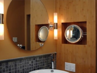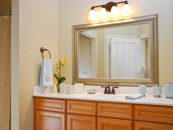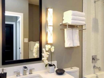 - Страницата на огледалото. Струва си да се отбележи, че ако се вземе решение да се монтира свещник отстрани на огледалото, тогава е необходимо да се закупят поне две лампи и да се подредят симетрично на една и съща височина. В такава среда осветлението ще бъде равномерно и без сенки, които пречат на бръсненето или нанасянето на грим..