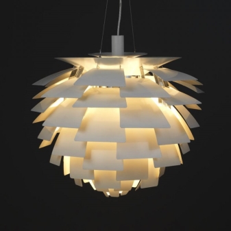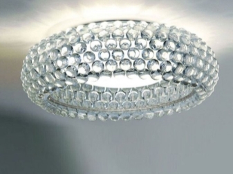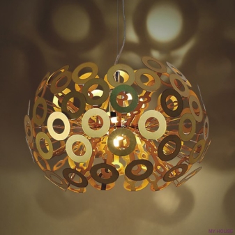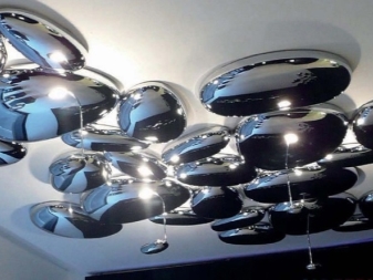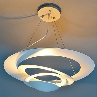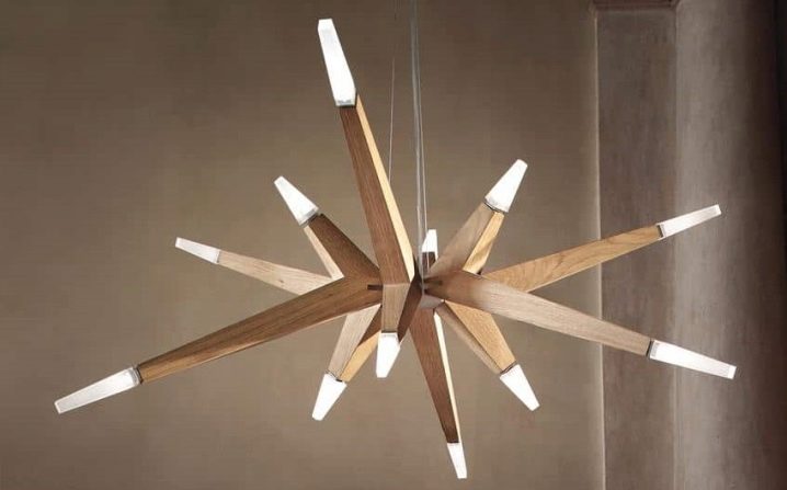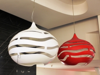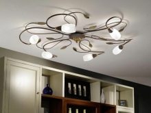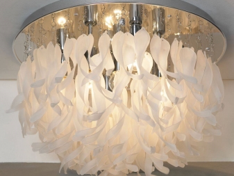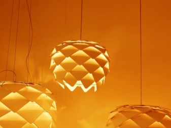 - Тавански дизайнерски лампи. Тази опция е подходяща за стая с ниски тавани. Всяка суровина, направена под формата на геометрична фигура, може да се използва като материал за сенките. Тези полилеи са подходящи за всяка стая. Недостатъците включват факта, че подмяната на лампата е невъзможна без отстраняване на самия плафон;