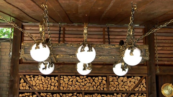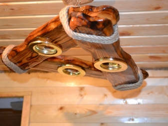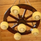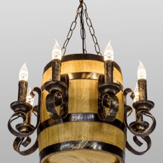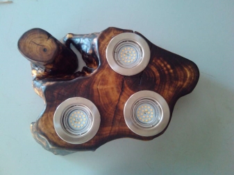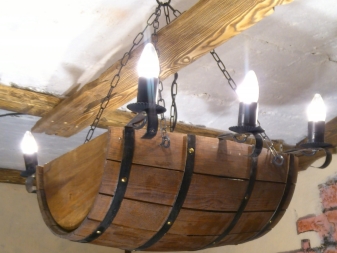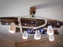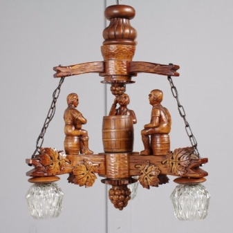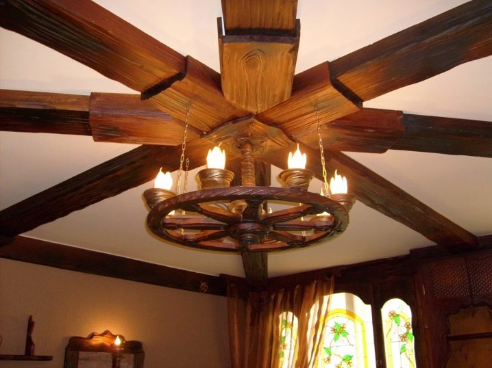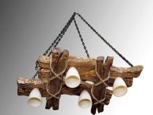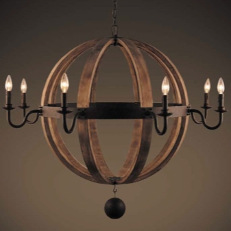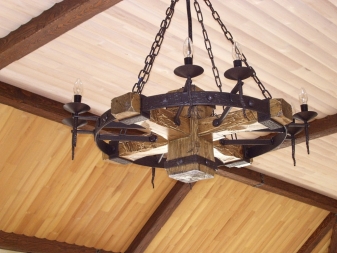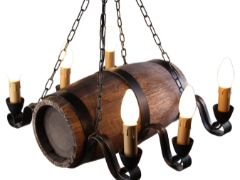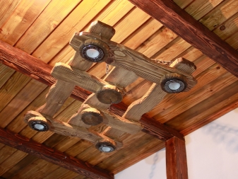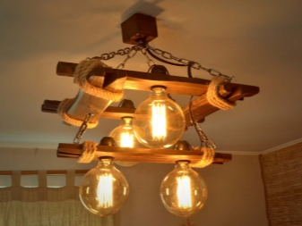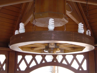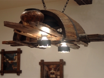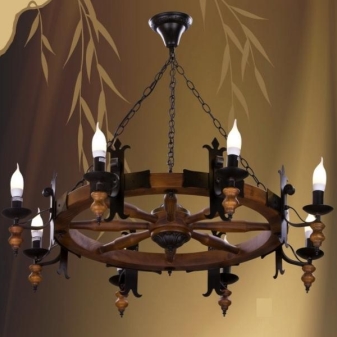 Дървените лампи представляват донякъде груба, тромава работа на майстор. Можете успешно да комбинирате модели с форма на количка, колела с лампи, които имитират свещи. На пазара има огромен брой LED лампи и лампи с нажежаема жичка за тях. Кафене, баня, рецепция в хотел, както и домашен интериор, стилизиран като селски или античен, незабавно ще се преобрази с такъв аксесоар..