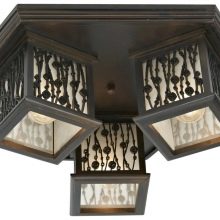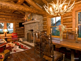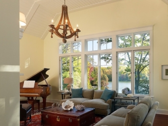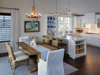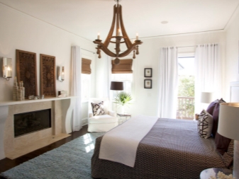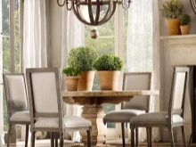 Има и полуантични опции, които могат да пресъздадат картина от времето на авангарда, романтизма и Средновековието. Дървени полилеи с плоска форма ще изглеждат оригинални. Те трябва да имат лампи, които имитират свещи. Можете да добавите нотки на простота и комфорт, използвайки селски стил и полилей под формата на решетки на въже. Изглежда страхотно в интериора на кухни, трапезарии, дневни.