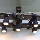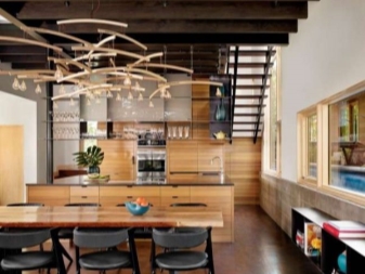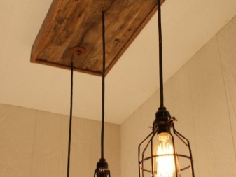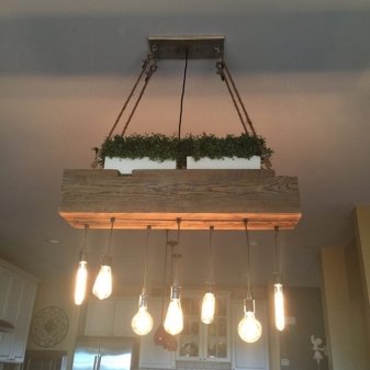 Фенове тавански помещения, тавански стил, най -вероятно те използват полилеи под формата на решетки, дъски. Освен лампи и крушки, върху тях можете да инсталирате стъклени буркани, саксия за цветя, кошница от ракита. Ще бъде за предпочитане да изберете цвета на махагон, тухла или тъмно кафяв нюанс. В този случай си струва да използвате ергономични флуоресцентни или LED лампи с дълъг експлоатационен живот..