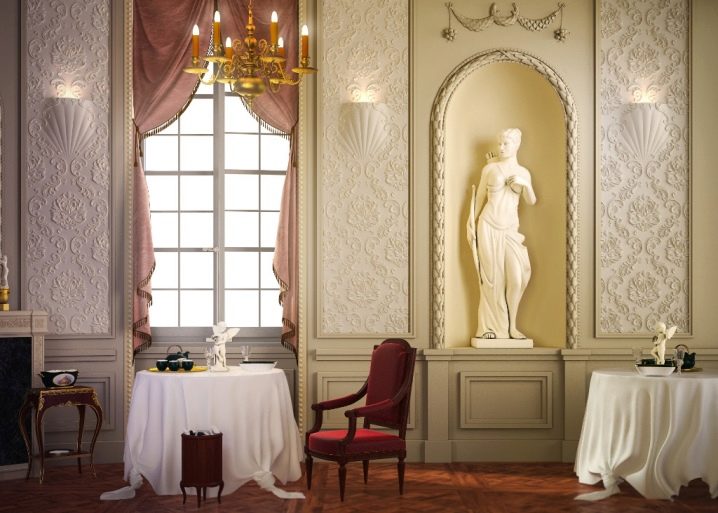 Неокласицизмът позволява използването на различни предмети в античен ключ. Колони, арки, мазилки, релефи, различни вази и скулптури, огледала, рамкирани с рамки – всичко това е насочено към постигане на тържественост и симетрия в интериора. За да украсите апартамент в неокласически стил, можете да украсите плафоните с позлата или сребро. Така обикновената стенна свещ ще се превърне в независим и необикновен декоративен елемент..